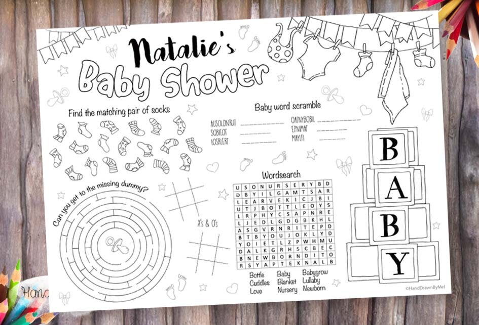 Baby Shower For Teacher Worksheets & Teaching Resources | TpT Baby shower activity page placemat printable on an 8.5 x 11 standard letter size paper or card stock.Includes:1 page PDF with Tic Tac Toe, Word Scramble, Word Search, The Dot Game & Word Match1 page PDF with all the answer keysReady to print at home or your local print shop.